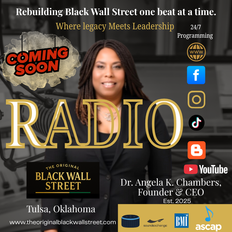 We are proud to announce the launch of The Original Black Wall Street, a groundbreaking new radio station founded by Angela K. Chambers, Ph.D. Broadcasting live from the heart of Oklahoma at 104 N Greenwood Avenue, in the historic Greenwood Business District—known worldwide as Black Wall Street—this station is more than radio; it’s a movement.