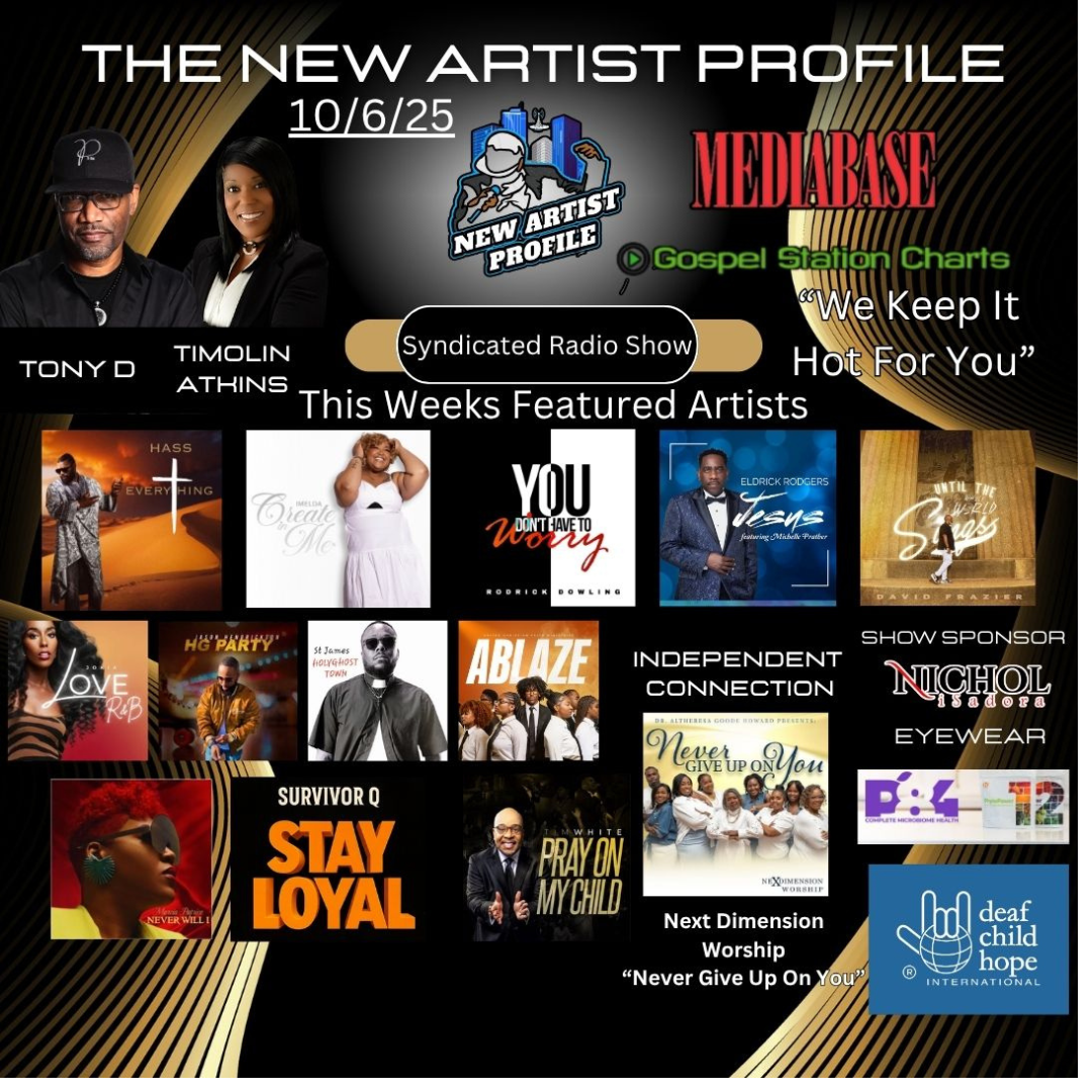 Hosted by Dallas Frazier, known on air as Tony-D, The New Artist Profile showcases the next generation of gospel music. From rising stars to breakthrough independent artists, Tony-D gives audiences an inside look at the sounds shaping the future of gospel. Plus, tune in for the Mediabase Top 20 Countdown, featuring the hottest songs and chart-topping hits in gospel music nationwide.