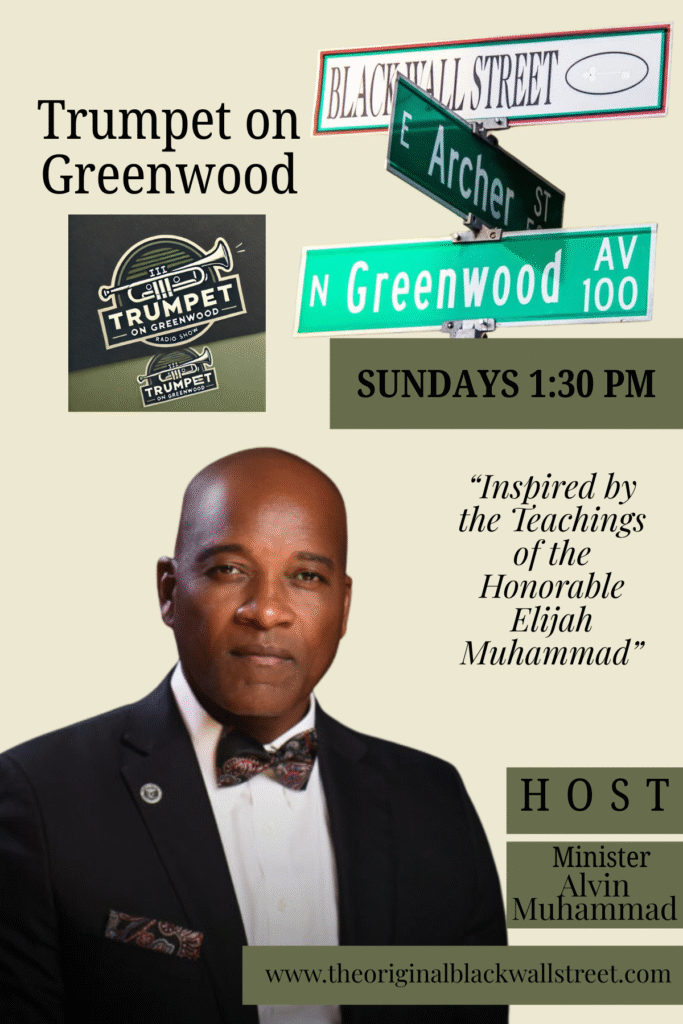 Tune in to “Trumpet on Greenwood” with Minister Alvin Muhammad every Sunday at 1:30 PM CST on The Original Black Wall Street Radio Station — where the trumpet still sounds, the people still rise, and the legacy of Greenwood continues to live.